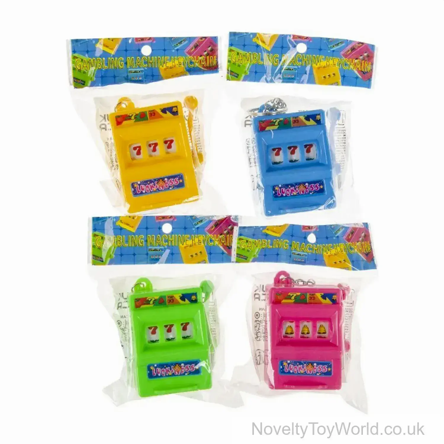 A working one-armed bandit mini slot machine, attached to a sturdy metal keyring. Priced individually and supplied in a mix of colours. Simply pull the handle and watch the items spin round and line up randomly. Excellent as low cost party bag fillers. Mini slot machine measures 6.7cm x 5.4cm x 3.2cm.