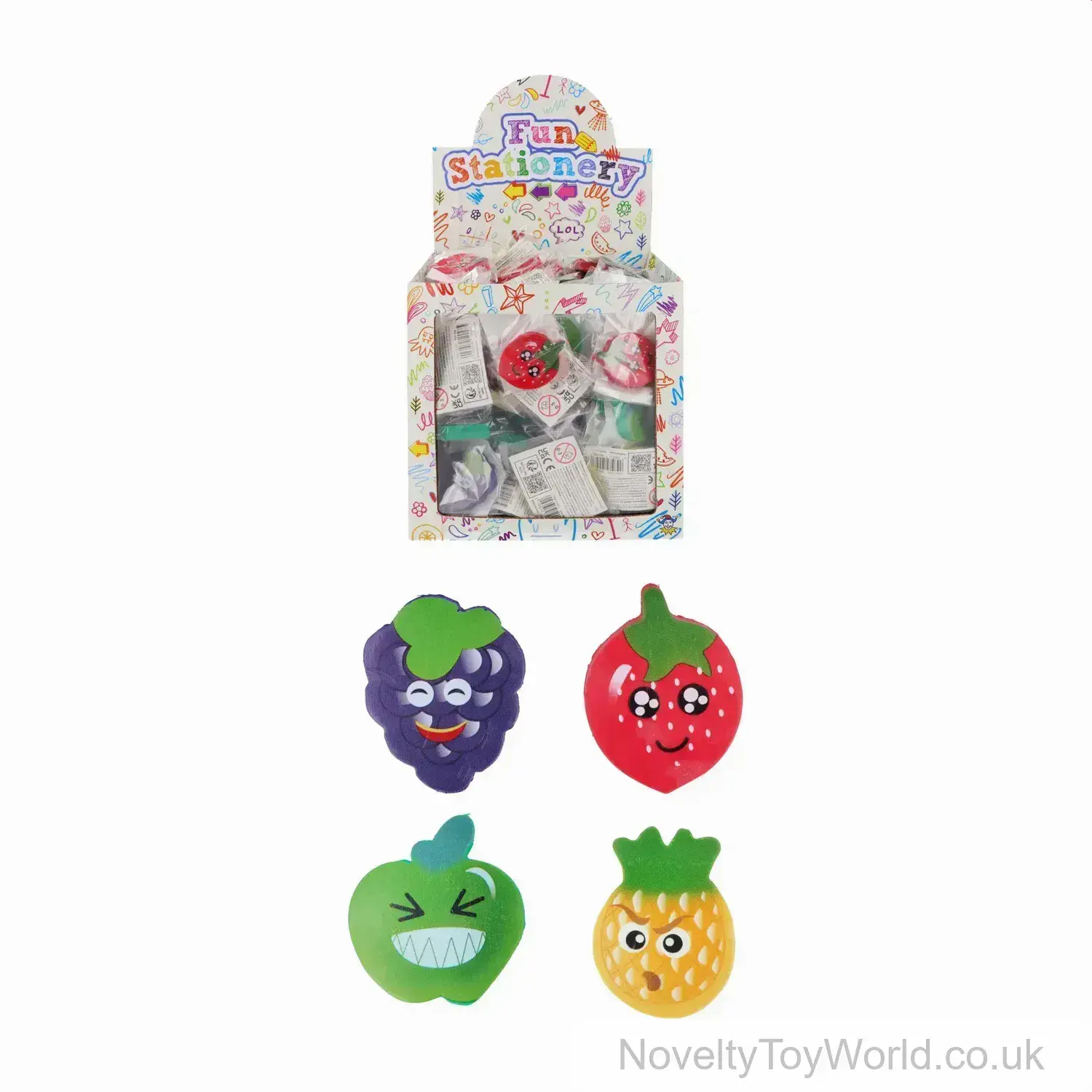Each eraser is designed to look like a smiling fruit character, supplied in a mix including grape, strawberry, apple, and pineapple. Perfect for school, office, or as party bag fillers. Each measures 3.5cm and comes in assorted designs.