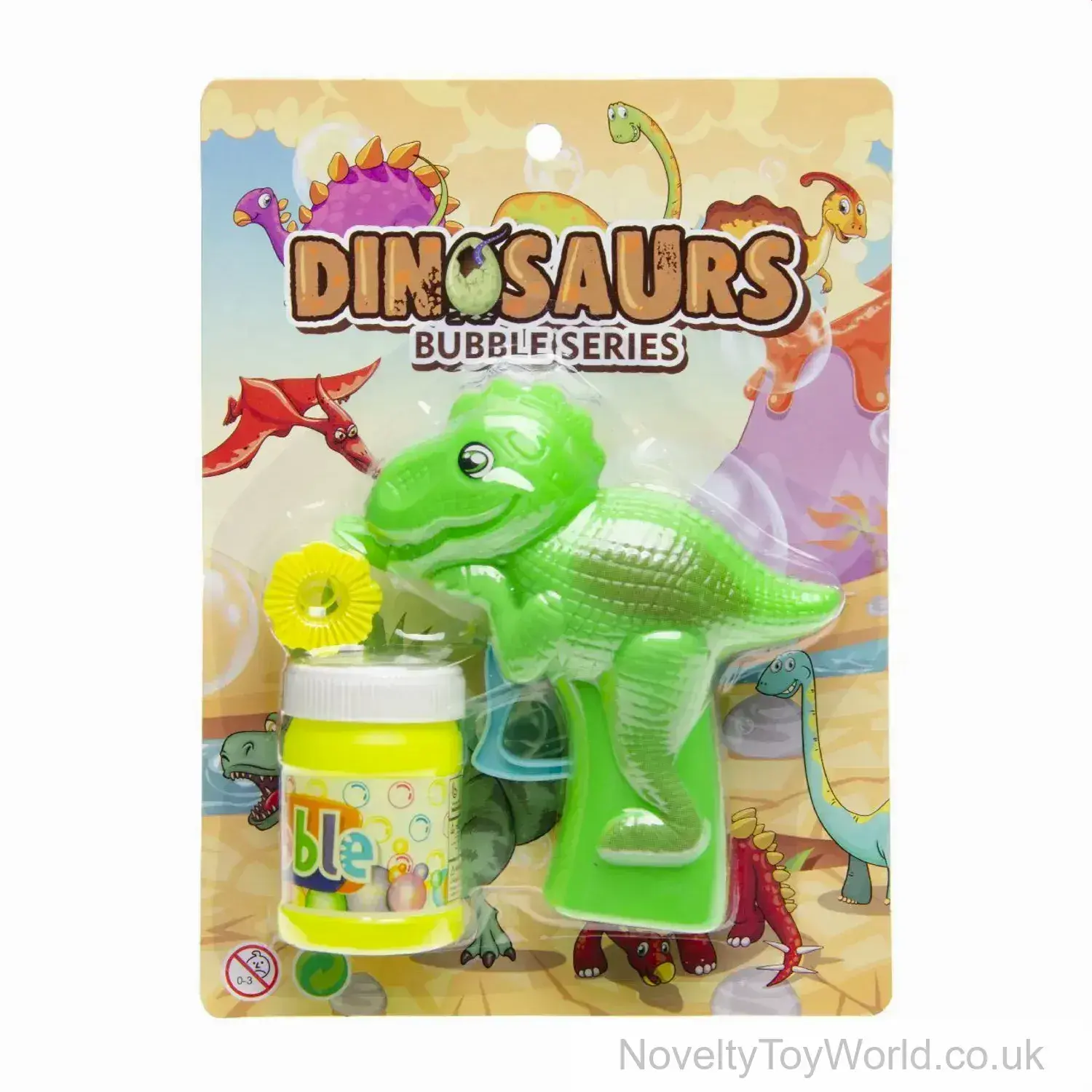 Powered by friction, once the trigger is squeezed, a flurry of bubbles will fire out of the dinosaur's mouth. Supplied with blowing bubble liquid, in 3 different colours and priced individually. Presented inside display packaging for retail sale - packaging measures 21.5cm x 15.5cm, dinosaur bubble gun measures 12cm on the longest side.