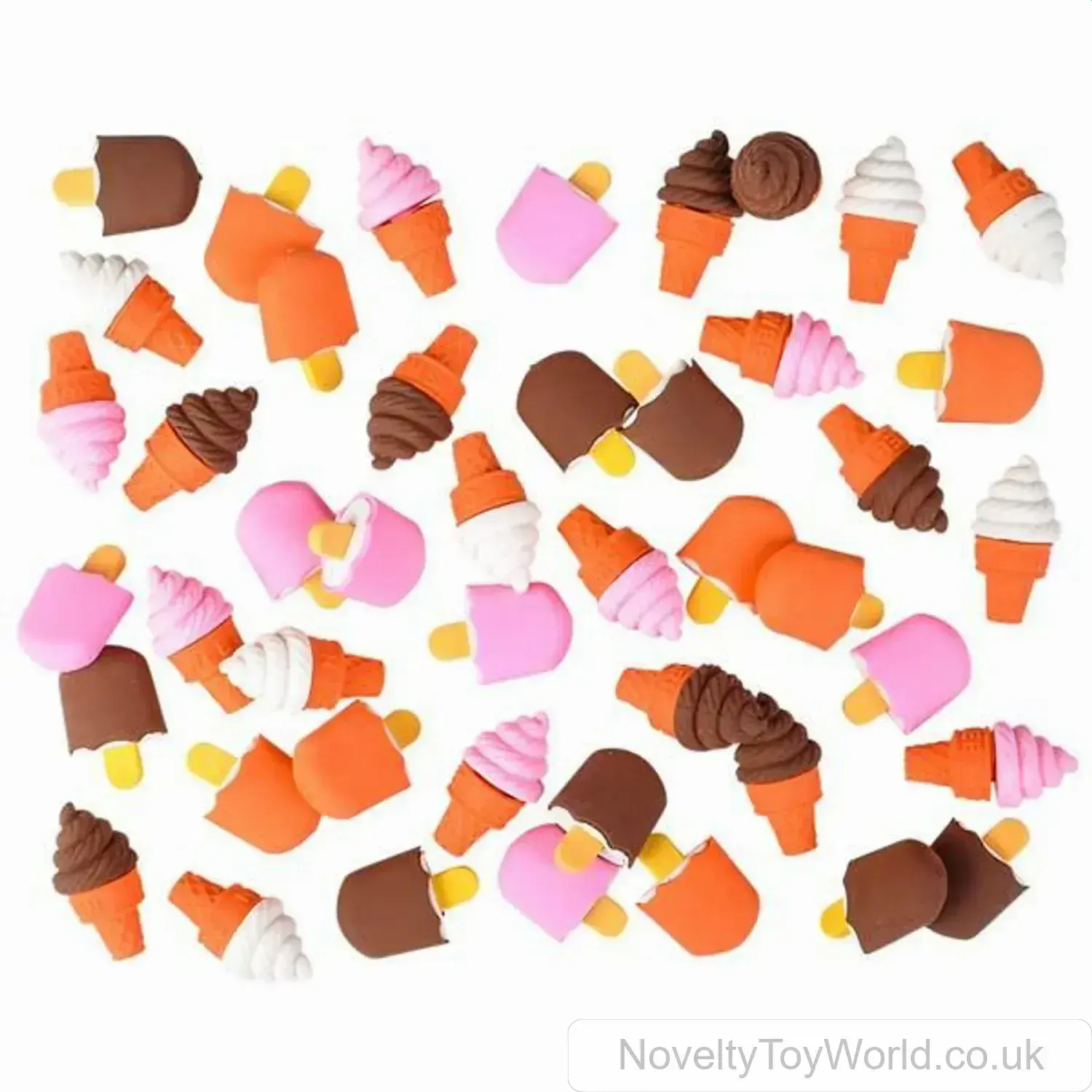 A selection of novelty ice cream eraser rubbers measuring 3.5cm. A fun stationery supply for children and schools. Each eraser is made of solid rubber, supplied at an excellent wholesale price making them great party bag fillers and inexpensive pocket money gifts.