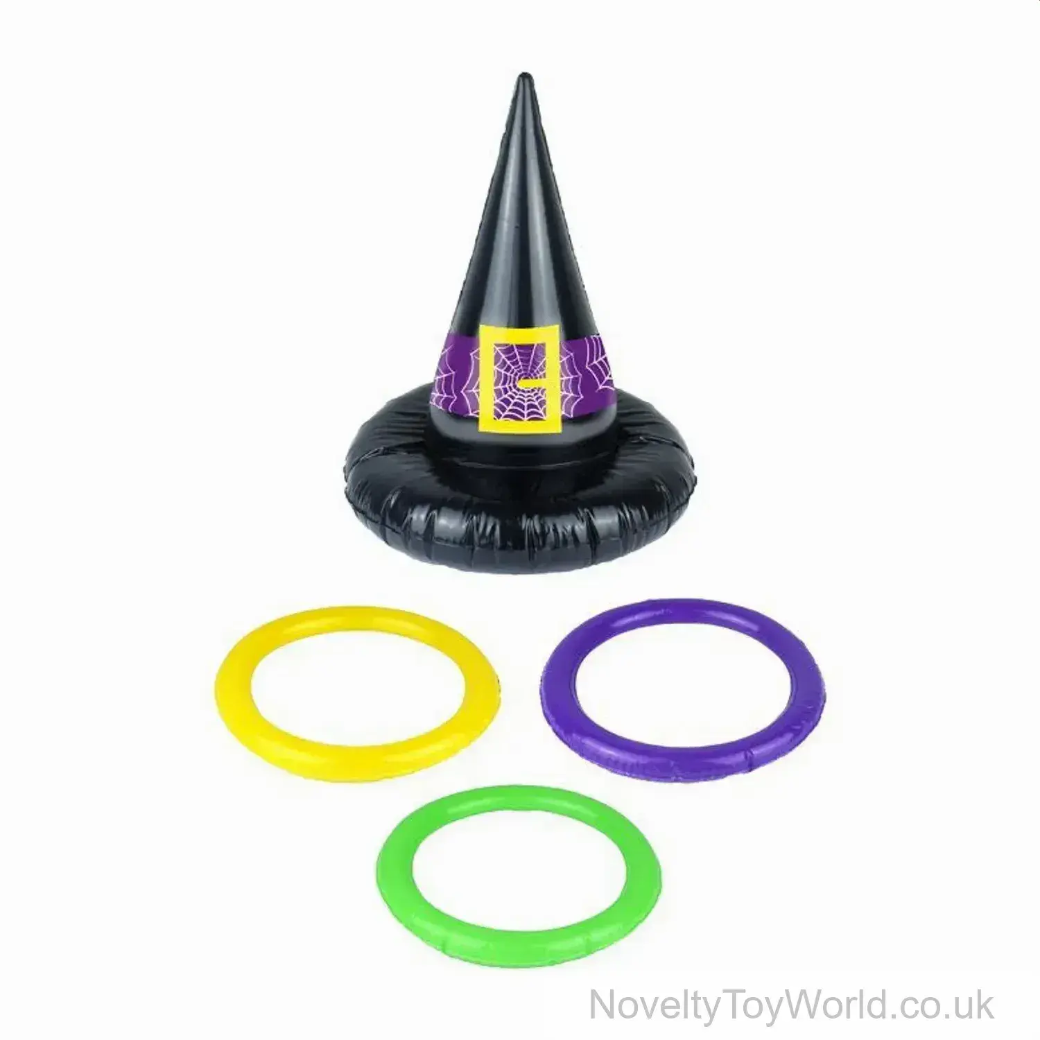 A great novelty inflatable party game for all the family at Halloween, these inflatable witches hats can be worn on the head while the opposing team aim to through the inflated hoops on top of the hat! All pieces are easily mouth inflated. Supplied at a discount wholesale price, perfect for sale in UK toy shops around Halloween. Can also be used as part of a witches fancy dress costume!