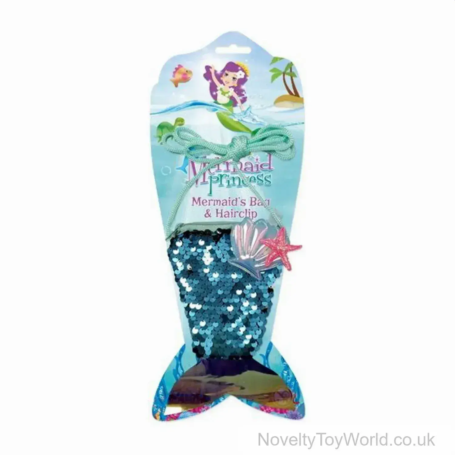 Shimmering mermaid-tail sequin purse with matching starfish hair clip, measuring 12cm and with a holographic tail fin. Includes strap to hand around shoulder. Presented on display card for retail sale. Excellent as gifts for girls, supplied at a bulk discount price.