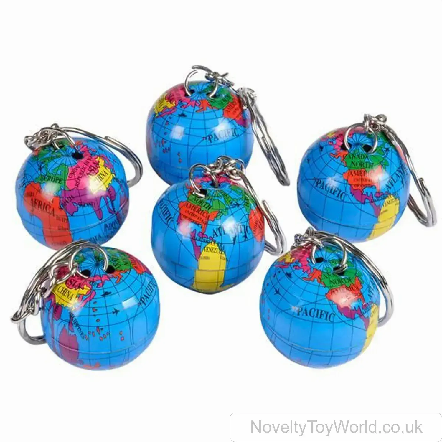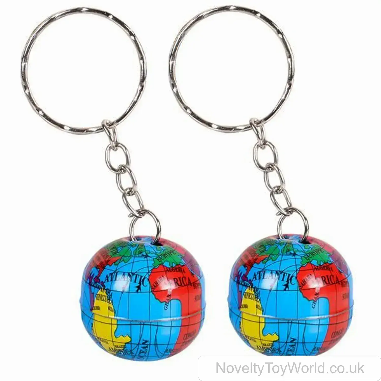 A coloured replica of the world on a keyring. This globe on a chain measures approximately 2cm. Made of metal. A cool novelty toy or low cost party bag filler. From our huge range of wholesale novelty keyrings.