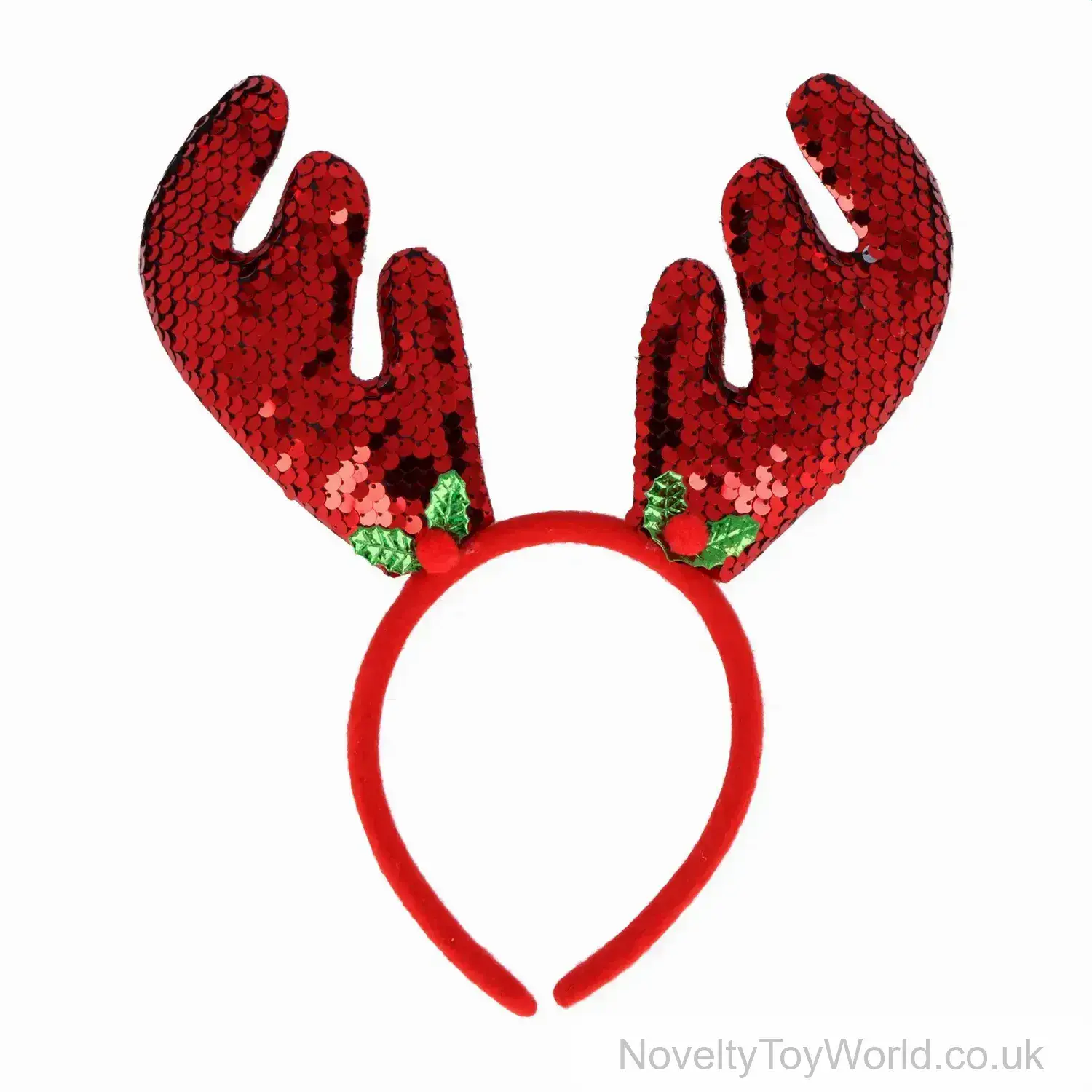 Christmas reindeer antler headband decorated with shiny red sequins and holly leaf details. Designed for adult wear, it’s lightweight and comfortable, perfect for Christmas parties, fancy dress events, and festive celebrations.